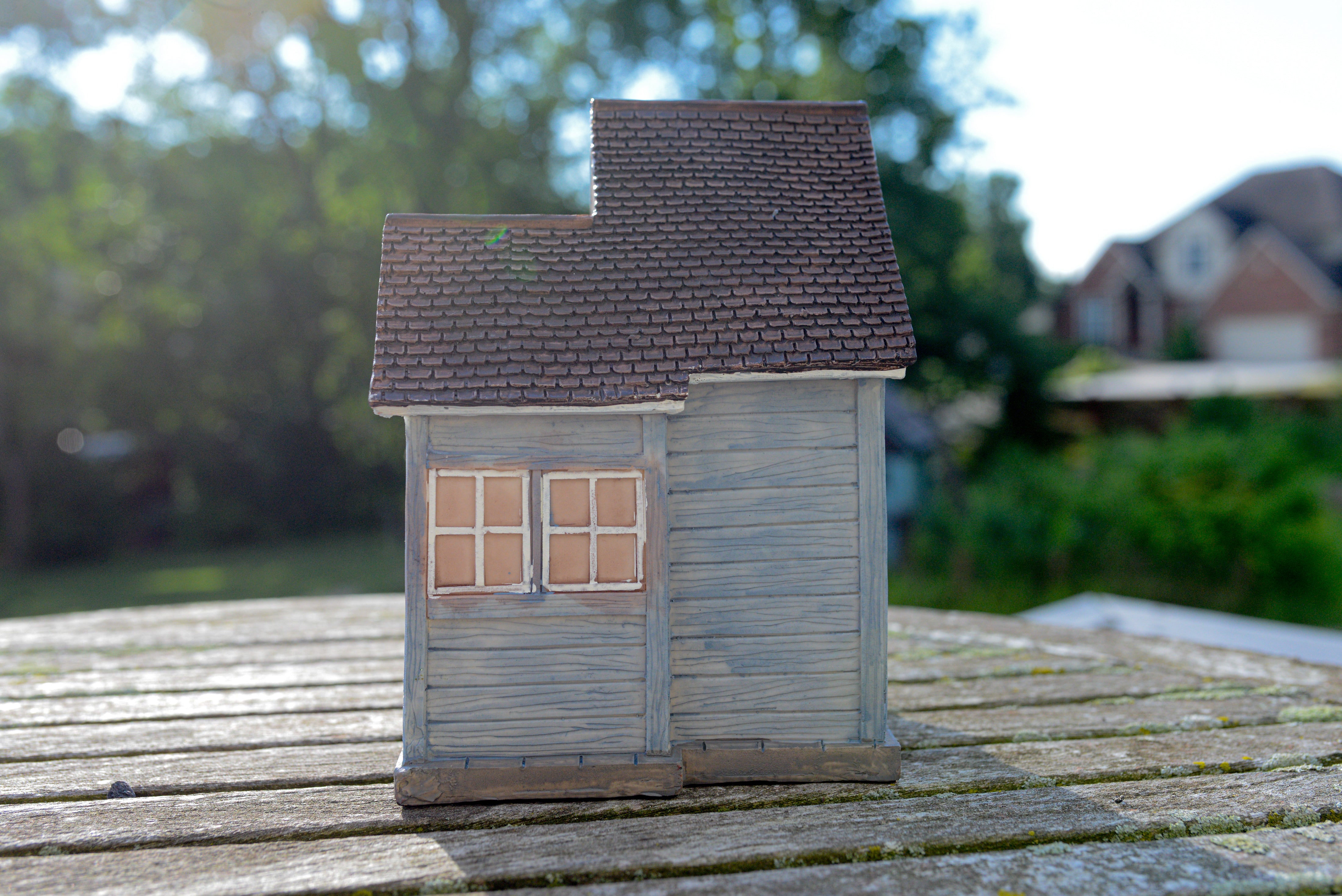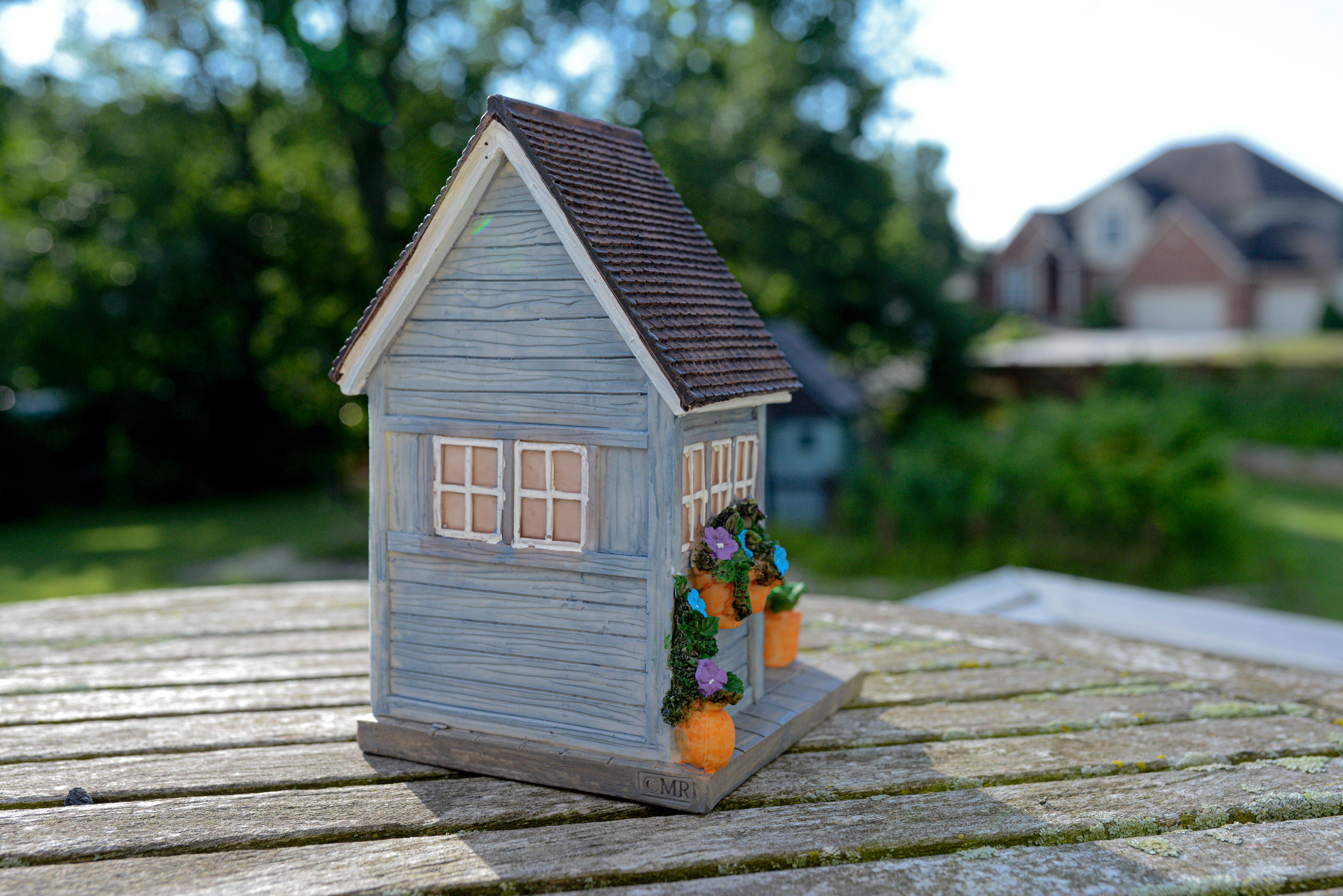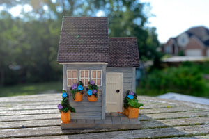 This adorable litte cottage feautures welcoming potted flowers by the front door and kitchen windows. The perfect lake get-a-way.  Add a matchind shed for all your fairy's lake gear!