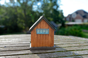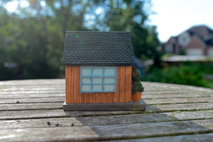 The shed is 3 1/2" W 4 1/4 L 4 1/2" H and comes in Natural or Cedar