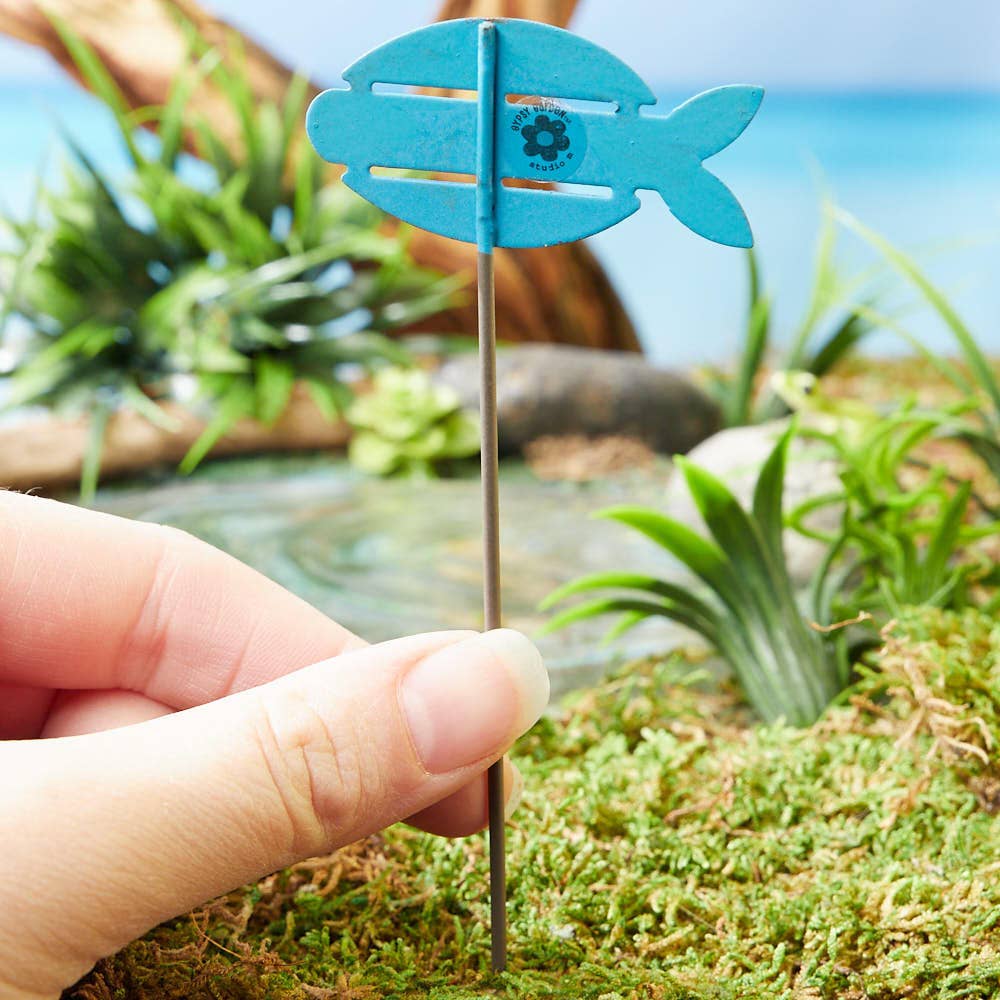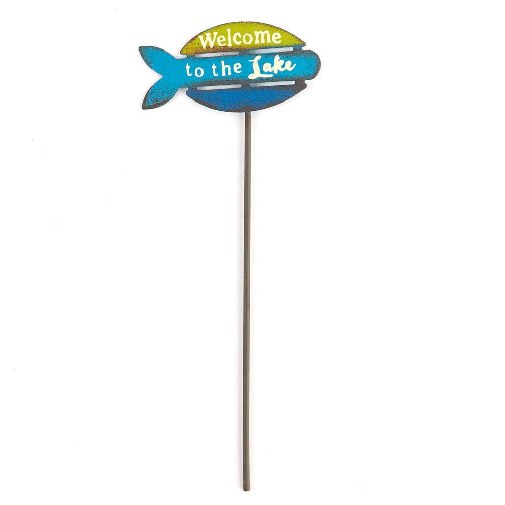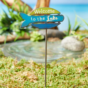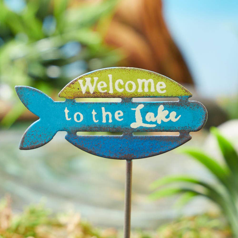This Miniature Rustic Metal Welcome to the Lake Sign will welcome guests to your tiny lake scene. Made of metal and painted with all-weather paint, it is perfect for both indoor and outdoor use. Place the tiny sign in any miniature scene, flower arrangement, or other display. Size: 2" x 5" Material: Rustic metal