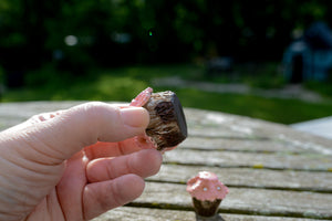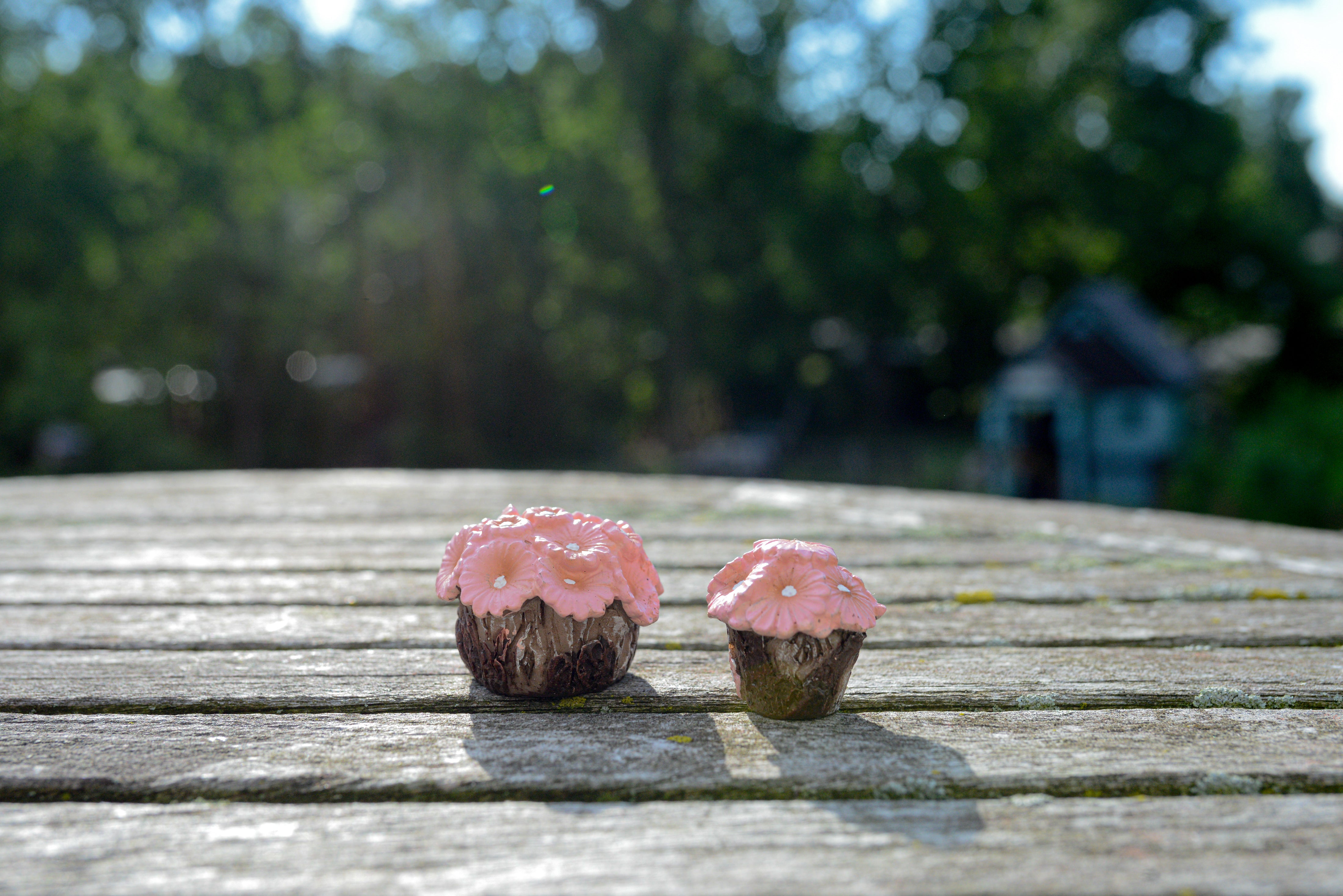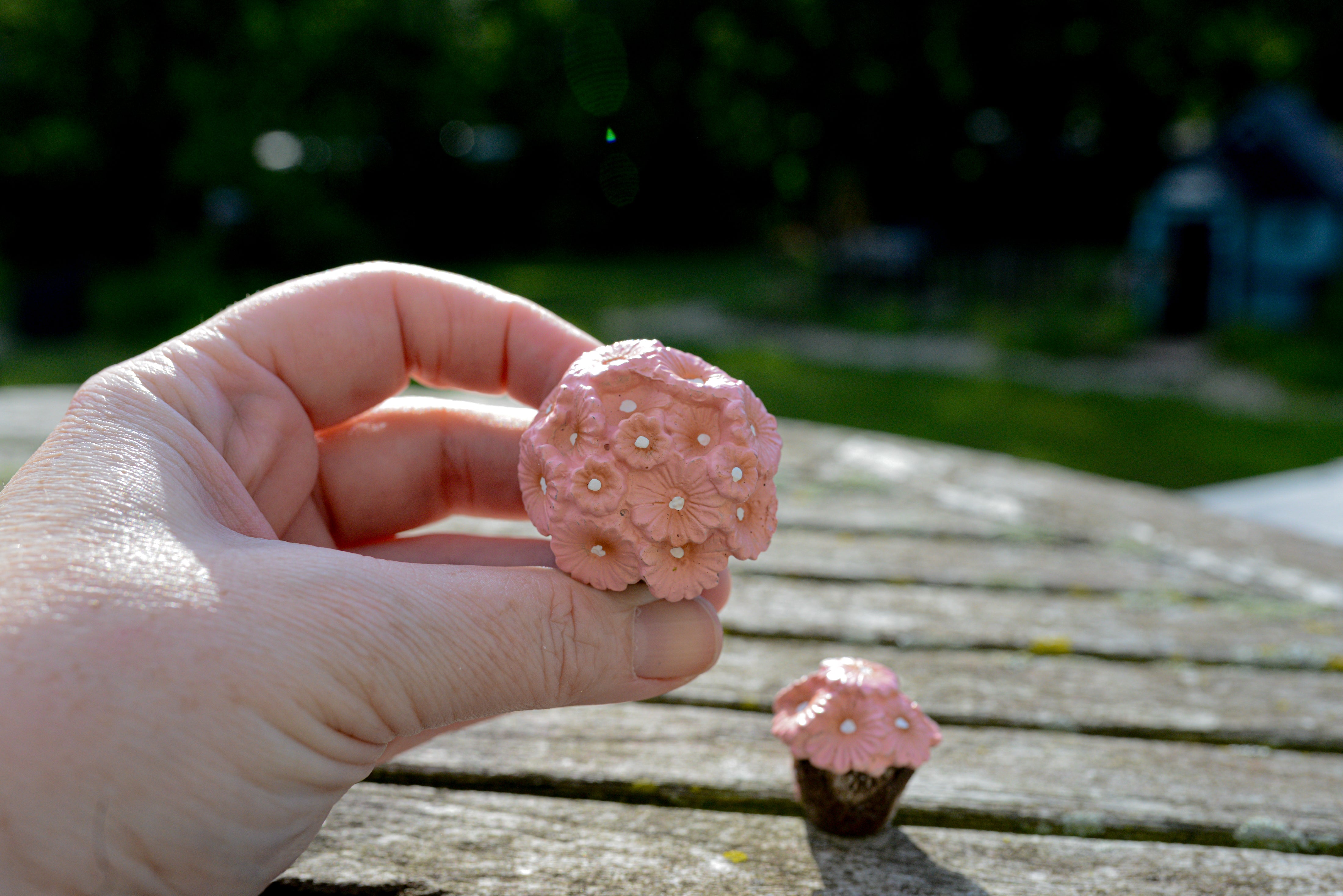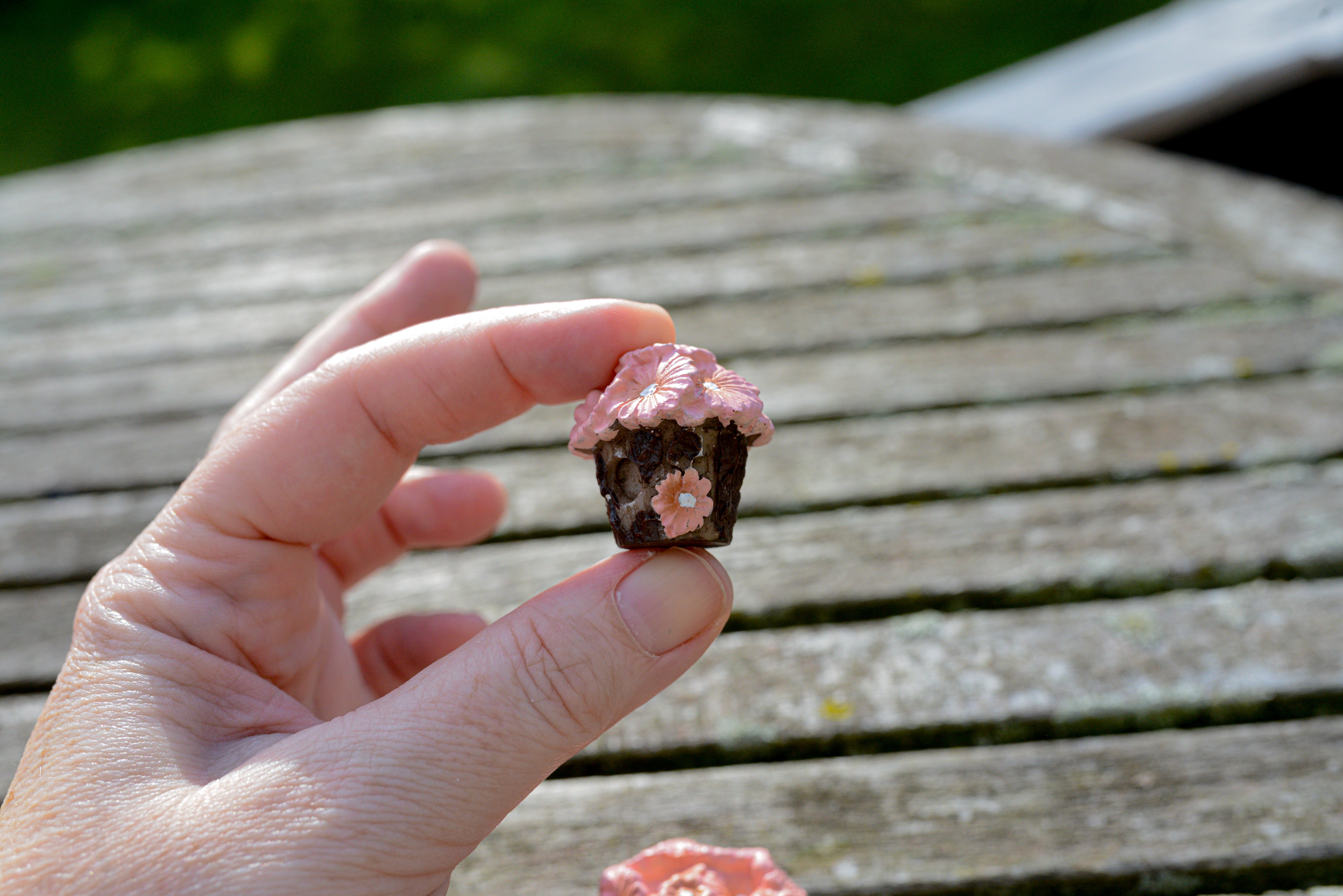 These beautiful pink potted flowers will add a pop of color to your fairy patio, bench, or entrance-way.