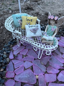 For the fairy with sophisticated taste this beautiful woven Chaise adds both beauty and comfort to any well manicured patio or garden. This can be ordered as is or with 3 pillows! They say Kindness, Love, and Believe.