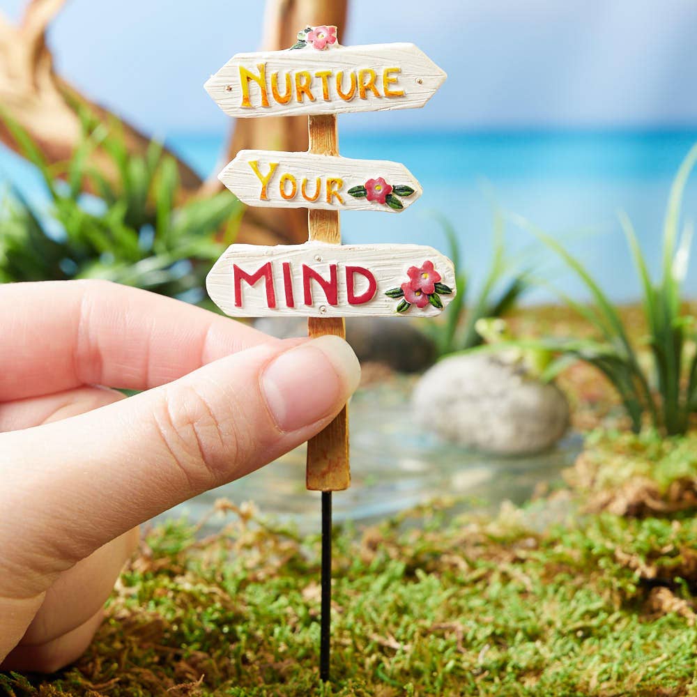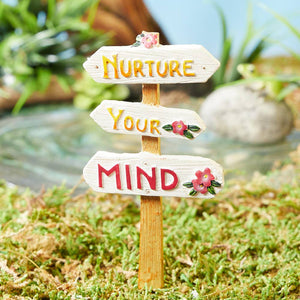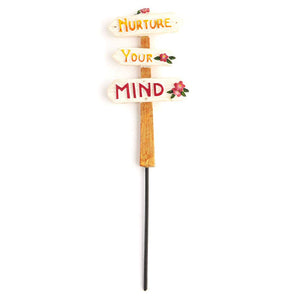 This Nurture Your Mind Sign Pick was designed by the artist Mary Engelbreit for her world of Merriment Fairy Garden Collection. Made of resin and painted with an all-weather paint. Size: Overall with pick: 5-7/8" (bottom of stake to top of sign) Sign: 1-3/4" x 3-1/2" Made of resin Use indoors or outdoors